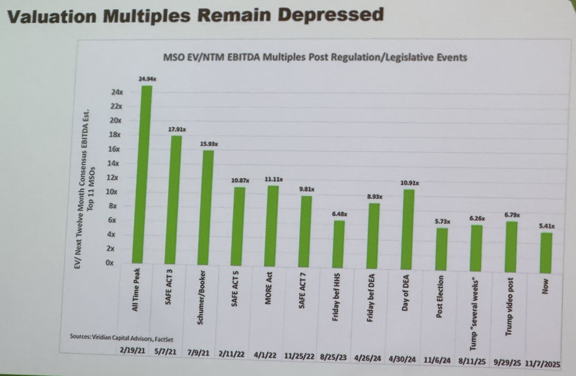 Scott Greiper of Viridian started the day with a chart showing how depressed industry valuations are as a function of tepid top-line growth. Math doesn’t lie and facts aren’t insults, but it was interesting to note that there was no mention of intoxicating hemp, its recent ban, or the implications for forward growth once THC is treated as THC.