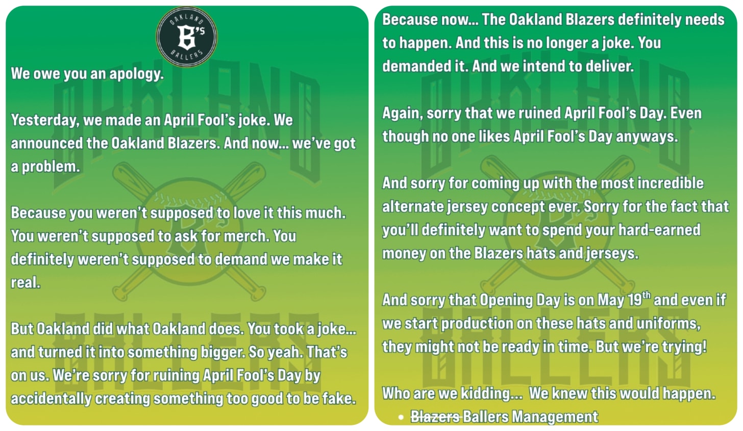 “Maybe it’s the first April Fools’ Day joke that we now have to do in real life,” Ballers co-founder and CEO Paul Freedman told me in a phone interview on April 2, less than 30 hours after the following message was posted to the team’s official Instagram account shortly past noon on April 1: